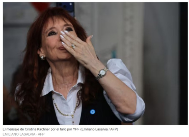 La expresidenta Cristina Kirchner publicó un mensaje en sus redes sociales para referirse al histórico fallo de la Justicia de Estados Unidos a favor de la Argentina en el juicio por la expropiación de YPF, decisión que eximirá al país de pagar US$18.000 millones.